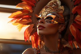 Serene carnival moment masked woman on evening swing, colorful carnival images