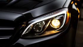 Car headlights illuminate the night, assembly line car production, assembly line car manufacturing