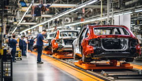 Assembly line workers building cars, assembly line car production, assembly line car manufacturing