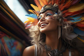 Carnival attendees in vibrant winged costumes, festive carnival photos