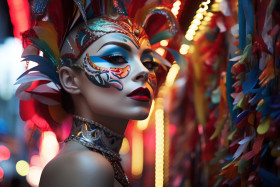 Glowing carnival woman in vibrant mask and neon lights, carnival festival pictures