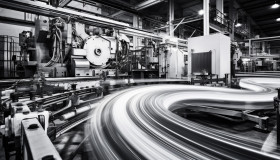 Factory floor in motion, industrial machinery stock images ai, midjourney prompt ideas
