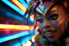 Glowing carnival mask woman takes part in vibrant nighttime run, colorful carnival images