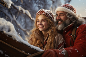 Couple celebrates the magic of the season on a sleigh ride, valentine, dating and love proposal image