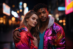 couple electric lights adventure valentines valentine day city fashionable nightlife glamour cityscape chic fashion stylish vibrant vibes energy ambiance modern urban street hyperrealistic evening scene neon hd style trendy lifestyle life night festival culture downtown outfits atmosphere experience contemporaryImagine Buddy