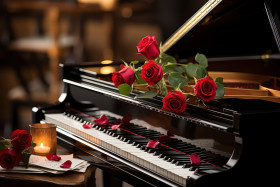 A red rose and sheet music create a melodic scene on the grand piano, engagement, wedding and anniversary image
