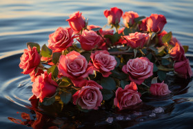 Tranquil waters carry a boat adorned with the beauty of red roses, engagement, wedding and anniversary image