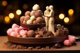 Couples twirl and dance on a chocolate carousel adorned with heart shaped truffles, valentine, dating and love proposal image