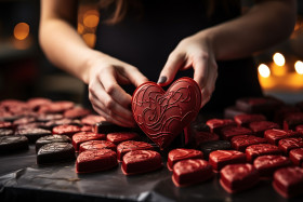 Hands skillfully crafting a red ribbon bow on heart chocolates, valentine, dating and love proposal image