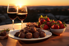 Chocolate dipped strawberries under the long shadows of sunset, engagement, wedding and anniversary image