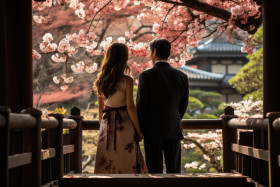 Romantic proposal surrounded by cherry blossoms in a japanese garden, engagement, wedding and anniversary image