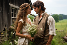 Bridal flower exchange in a quaint meadow with rolling hills and barn, engagement, wedding and anniversary image
