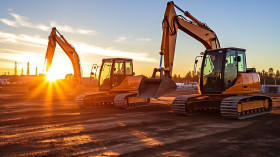 A construction site with two heavy wheeled tractors one excavator and other machinery, industrial machinery stock images ai, midjourney prompt ideas