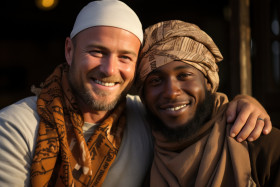 Afternoon sunlight illuminates the embrace of two men with white headscarves, ramadan and eid mubarak images