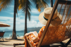 Woman unwinding on a deck chair in tropical paradise, summer landscape image