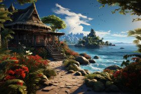 tropical jungle island wooden cottage aesthetics traditional hut island escape tropical island scene tropical island oasis jungle cottage jungle haven island living lush jungle jungle paradise tropical hideaway island paradise tropical haven serene retreat island oasis jungle retreat tropical bliss wooden hut wooden cottageImagine Buddy