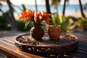 wooden table palm trees beachside retreat tropical escape wooden table aesthetics coastal elegance beachside serenity sunny shoreline setup white background tropical retreat seaside simplicity beachside scene coastal getaway palm tree panorama beachImagine Buddy