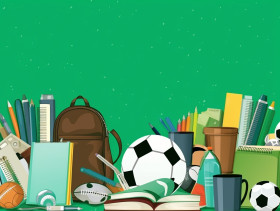 Many teaching devices books back to school supplies on green background with copy space, digital illustration, character illustration