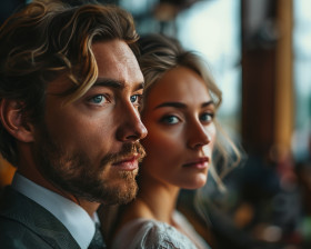 Businessman and woman in a formal setting deep in conversation, business meeting photo