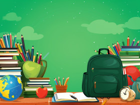 Many teaching devices books back to school supplies on green background with copy space, digital illustration, character illustration