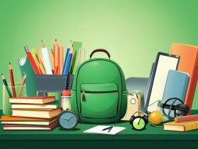 Many teaching devices books back to school supplies on green background with copy space, digital illustration, character illustration
