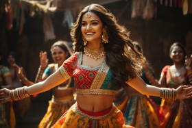 woman traditional indian dance performance lohri makar nature agriculture wheat festival hindu india makar sankranti hyperrealistic hd costume elegance classical colorful female dancer stage culture movement expressive cultural graceful celebration tradition entertainment woman heritage traditional attire art rhythm poseImagine Buddy