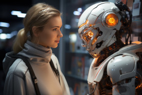 woman talking robot conversation technology interaction communication modern futuristic artificial intelligence robotic technology hyperrealistic hd chat ai contemporary digital machine advanced discuss dialogue interface human robot interaction future robotic electronic female device talk smart innovationImagine Buddy