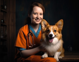 Female doctor in hospital holding corgi puppy, pet photo