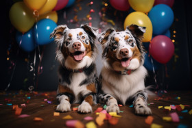 dogs happy party hats balloons celebration pet lifestyle cute animal hyperrealistic hd cheerful pets playfulness canine event companions leisure festivities furry outdoor happiness friends smiling playful gathering animals joy adorable funImagine Buddy