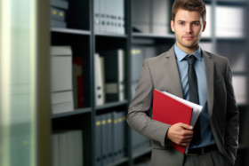 A businessman stands in an office holding a folder, hiring image for job postings