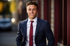 happy young man suit standing front building confident job hiring interview hyperrealistic hd positivity business career lifestyle attractive entrepreneur professional smiling business distric executive outdoors portrait achievement leader pose joyful city architecture success corporate urban leadershipImagine Buddy