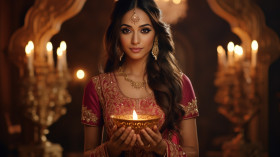 Indian bride holding gold diya, diwali festival stock image, diwali festival ai prompt