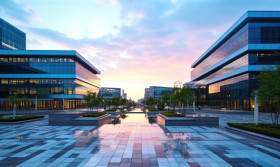 front courtyard business city building sunrise morning sunlight public transport travel transportation hyperrealistic hd new day architecture urban inspiration corporate cityscape exterior urban development outdoors tranquility office commercial property business district dawnImagine Buddy