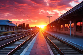 train station sun setting sunset platform tracks evening public transport travel transportation hyperrealistic hd outdoor journey nature peaceful railway public transport landscape urban silhouette beauty architecture orange sky scenic dusk commuting warm glow destination stationImagine Buddy