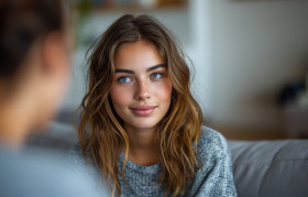 young woman talking sitting couch conversation communication interaction dialogue discussion acceptance accept agree hyperrealistic hd lifestyle connect friend listen indoor comfort leisure social chat home female people share casual relaxImagine Buddy
