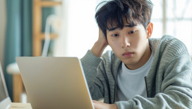 young asian man worried stressed out home laptop computer concern stress technology online acceptance accept agree hyperrealistic hd browsing frustration problems serious communication anxiety digital indoors thoughtful troubled lifestyle concentration using asianImagine Buddy