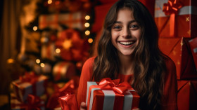 Happy girl smiling from the camera holding presents, christmas stock image ai, christmas stock photos ai