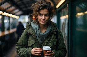 young woman coffee metro station drink urban lifestyle city morning commute public transport travel transportation hyperrealistic hd sidewalk vibrant leisure morning routine energy relaxation refreshment takeaway beverage city break bustling outdoor casual femaleImagine Buddy