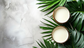 fresh coconut milk palm leaves tropical background exotic drink beverage refreshment natural palm sunday hyperrealistic hd paradise culinary summer lifestyle coconut organic tropical vibes tropical drink plant based healthy vegetarian culinary ingredientImagine Buddy