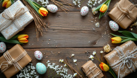 overhead wooden table decorations wrapped gifts willow tulip flowers easter eggs festive sunday hyperrealistic hd joyful occasion festive atmosphere festive table decoration cheerful festive celebration ambiance gifts holiday celebration party eggs vibrant spring decor seasonal colorful joy table settingImagine Buddy