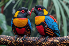 Colorful and black birds perched on a branch showcasing nature vibrant beauty and avian harmony, colorful tropical birds photo