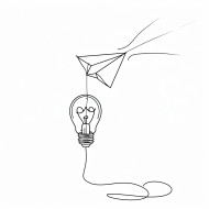 Minimal illustration of a paper plane in flight connected to a light bulb in one continuous line representing creative ideas taking off