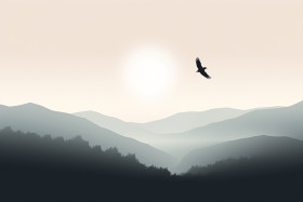 Minimalist monochromatic landscape featuring a solitary bird in graceful flight against a serene backdrop