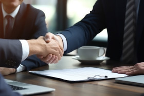Two business partners shaking hands over briefing table sealing successful deal in office meeting, acceptance picture