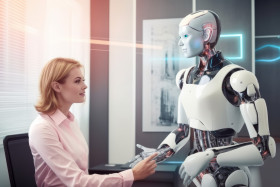 Robot stands before a woman in a conference room engaging in a futuristic interaction blending technology and human presence, robot working with human in offices concept