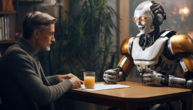 young man talking robot conversation communication futuristic tech technology artificial intelligence ai future automation hyperrealistic hd talk person science fiction interface machine interaction explore digital dialogue innovation discuss chat connect android modern aiImagine Buddy
