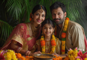 A joyous indian family proudly posing with a metal ornament celebrating their cultural heritage and unity, gudi padwa family celebration photo