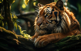 tiger resting woods jungle nature wildlife majestic wild animal wildlife day hyperrealistic hd feline peaceful beautiful powerful environment serene natural camouflage striped greenery wilderness vibrant outdoors predator tranquil relaxation spotImagine Buddy