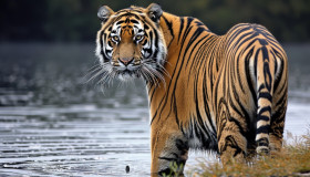 A magnificent tiger stands proudly near the water, majestic big cats photo