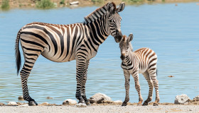 A mother zebra and her foal share a serene moment by the lake, baby animals concept